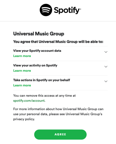 Il semble que nous ne soyons plus obligés de donner à un tiers la permission d'apporter des modifications à notre compte afin de pré-enregistrer une version. Si cette action est entre les mains de Spotify, nous pouvons être sûrs que des mesures ne seront pas prises à notre insu.