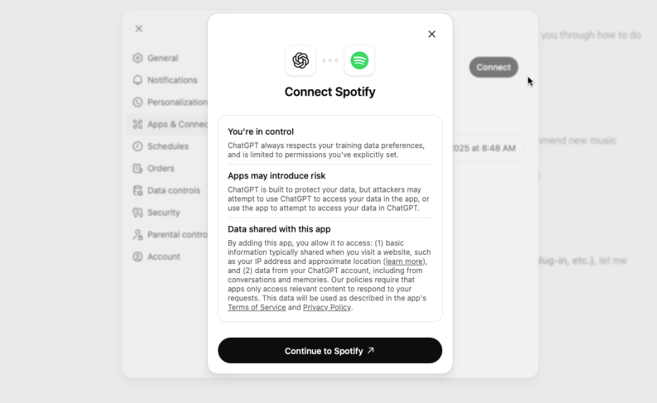 When you mention “Spotify” in ChatGPT for the first time, you’ll see a “Connect Spotify Account” pop-up. Log in and authorize access to start receiving recommendations.