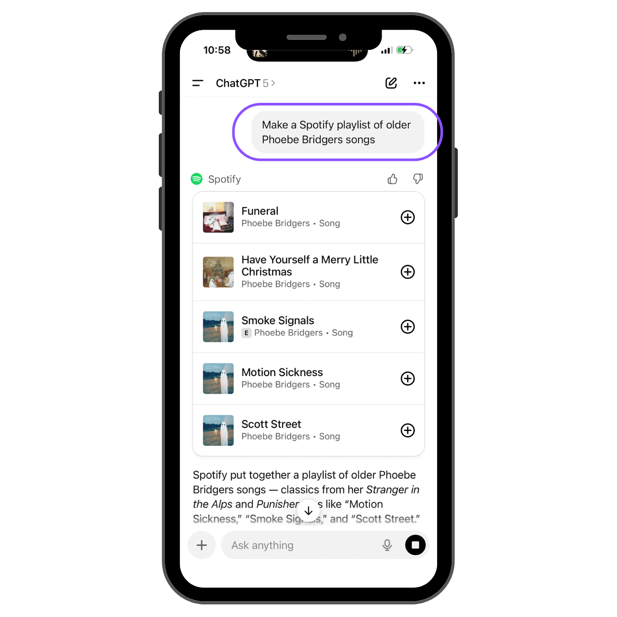 When someone types “songs for late-night driving” or “motivational indie music, ChatGPT surfaces playlists and tracks that match that vibe.