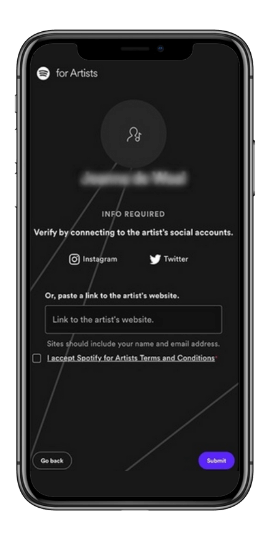 To finalize your verification, you must connect your Spotify account to your social media profiles (Instagram or Twitter) or provide a link to your official artist website.