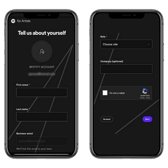 After selecting your artist account, Spotify will ask for some basic information to complete your verification. This includes: