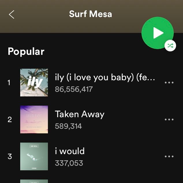 À ce jour, la chanson "ily (i love you baby)" de Surf Mesa compte plus de 86 000 000 d'écoutes sur Spotify . Sa deuxième chanson la plus populaire "Taken Away" en compte moins de 600 000.
